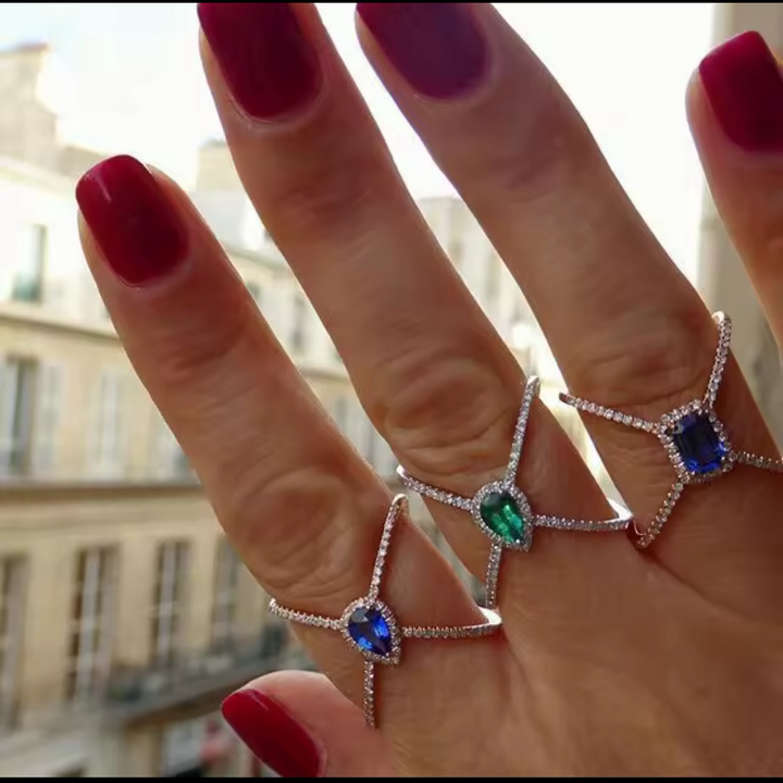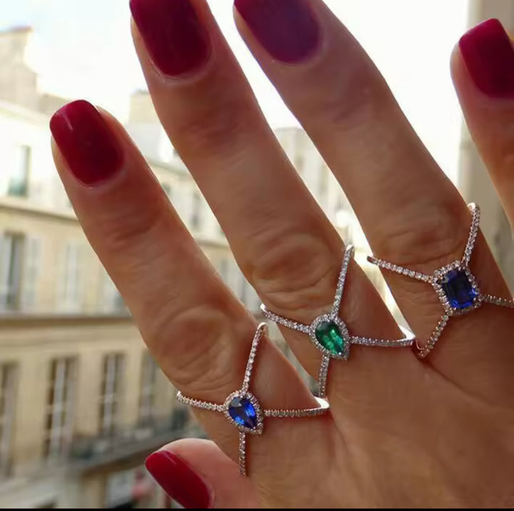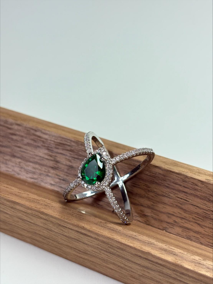 Bague en laiton plaqué or blanc zircone et pierre émeraude